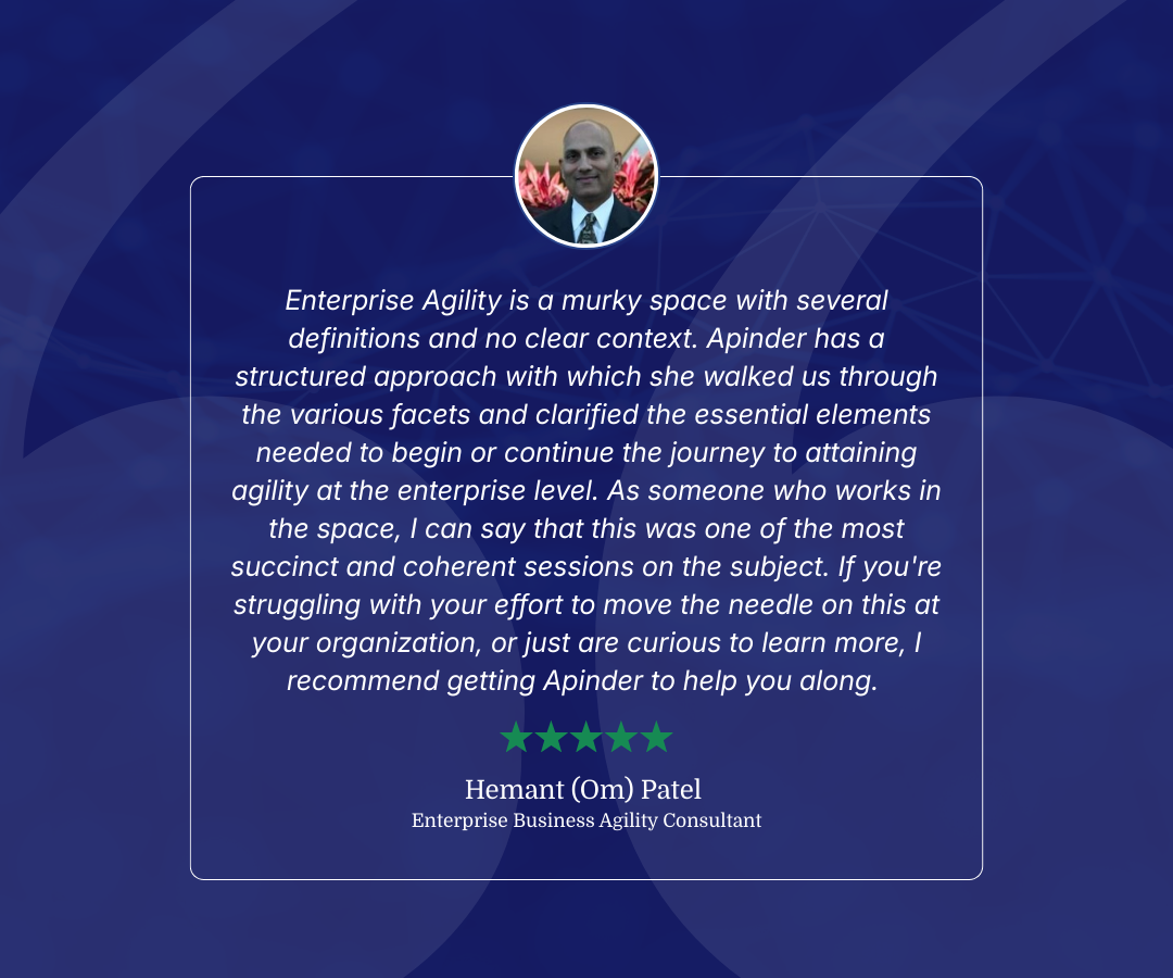 "Apinder teaches what actually works when you're navigating executive politics, resource constraints, and constantly shifting priorities. She doesn't teach theory — she teaches how to drive results in the real world."
